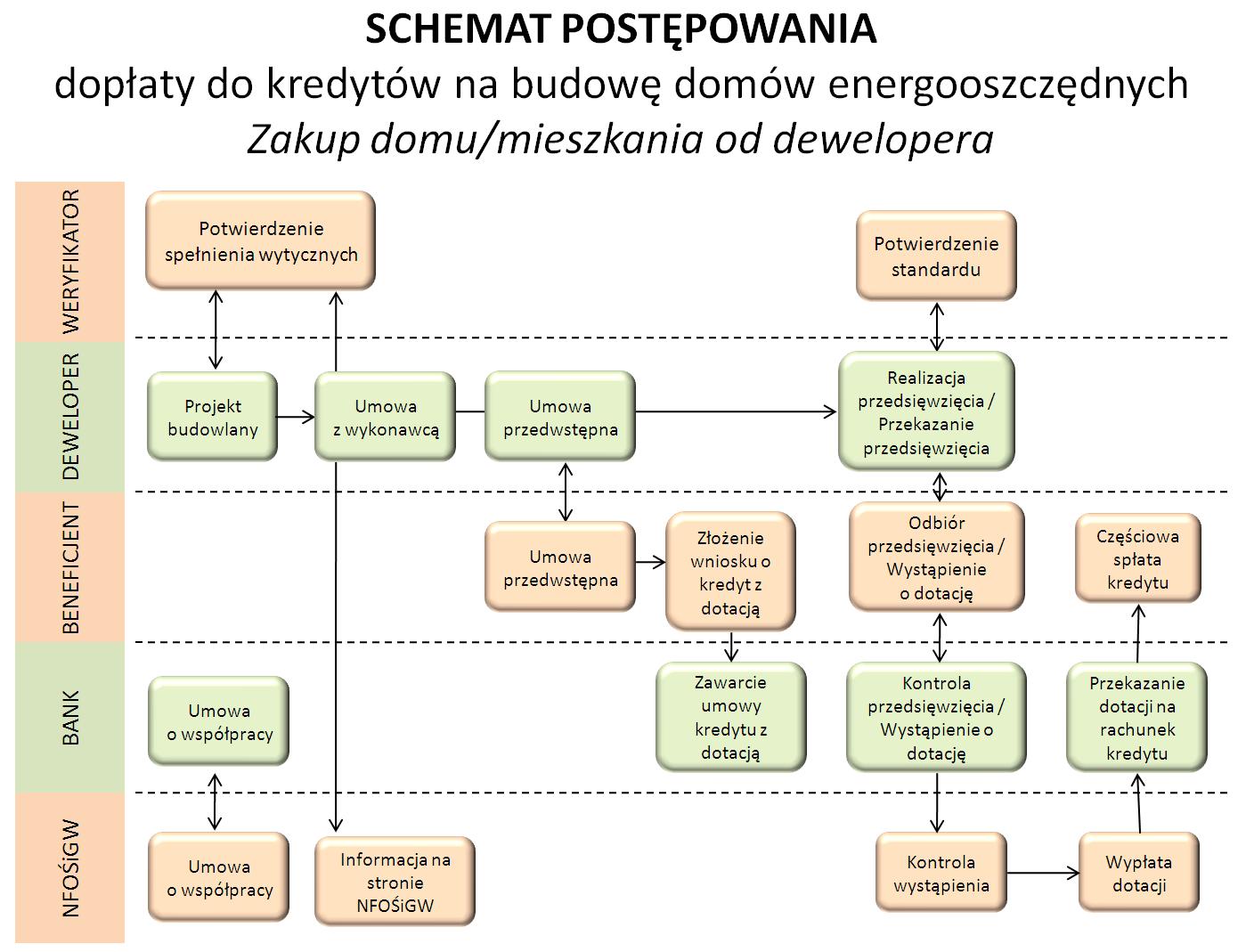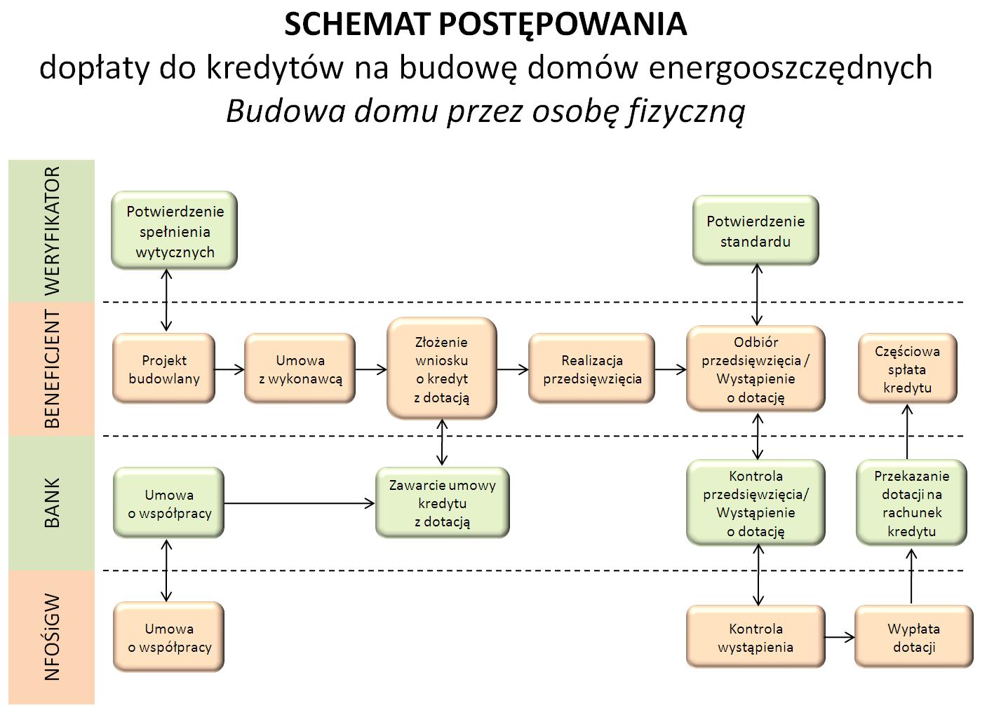Jednorazowe dofinansowanie zostanie wypłacone inwestorom po zakończeniu budowy oraz potwierdzeniu osiągnięcia zakładanych w projekcie oszczędności energii. Zainteresowani dopłatami nie będą musieli jechać do siedziby NFOŚiGW w Warszawie. Wystarczy zgłosić się do jednego z banków, które będą współpracowały z Funduszem, program bowiem będzie realizowany przy współpracy z sektorem bankowym. Oferowane przez Fundusz wsparcie finansowe będzie przeznaczone na częściową spłatę kapitału kredytu hipotecznego. Przekazanie pieniędzy odbywać się będzie bezgotówkowo, w formie dotacji wypłacanej bezpośrednio na konto kredytowe beneficjenta. Zakończenie realizacji przedsięwzięcia musi nastąpić w terminie do 3 lat od dnia podpisania umowy kredytu.